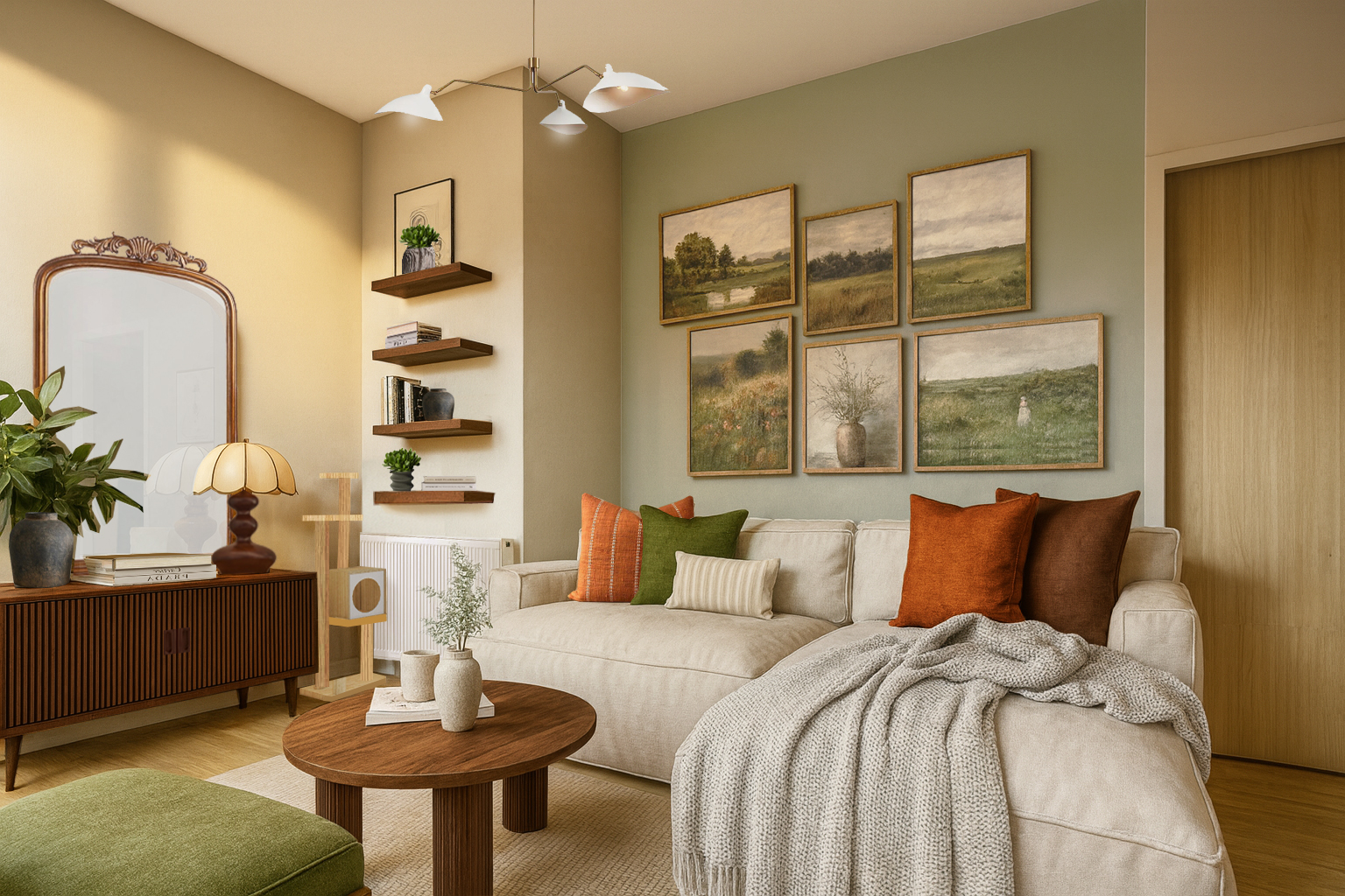 In the living room, a neutral base is enriched with layers of green, orange, and brown accents—echoing the natural landscape art displayed on the feature wall. The soft beige sofa, tactile throws, and walnut wood furniture create a harmonious balance of comfort and sophistication. Thoughtful details like the sculptural lighting, ribbed wood sideboard, and retro-inspired chair bring a subtle vintage charm.