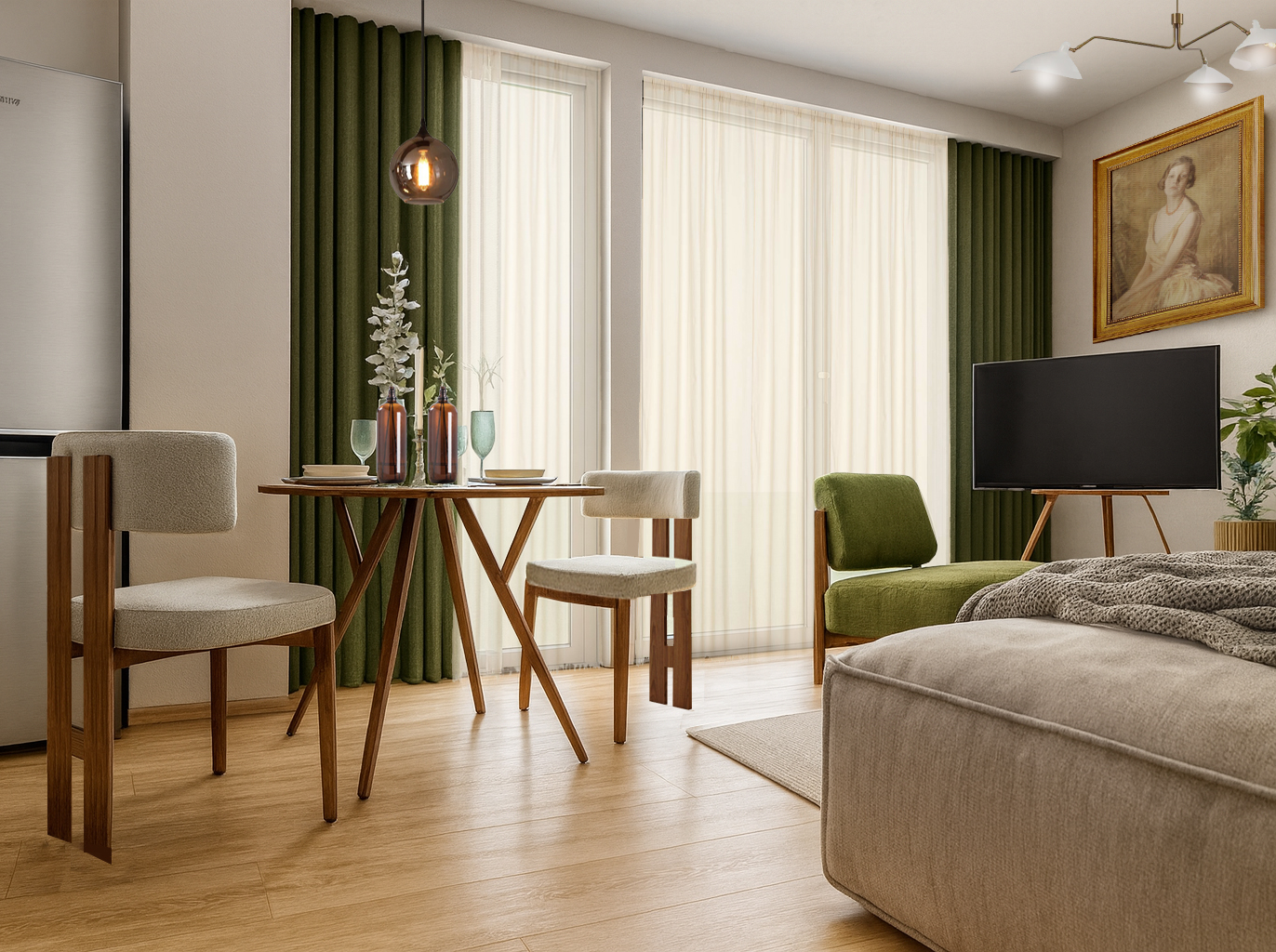 This interior project embodies a calm, inviting atmosphere rooted in earthy tones and natural textures. The design blends contemporary simplicity with mid-century warmth, creating a timeless aesthetic that feels both elegant and lived-in.
