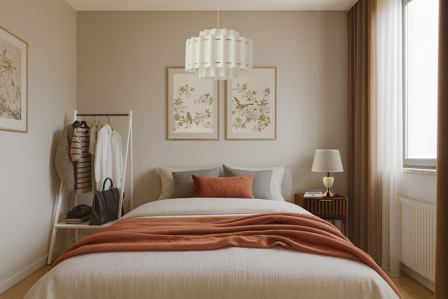 The bedroom continues the story of softness and warmth, where neutral bedding meets terracotta textiles and botanical art prints. Every element—from the drapery to the lighting—was curated to enhance serenity, making the space a perfect retreat for rest and balance.