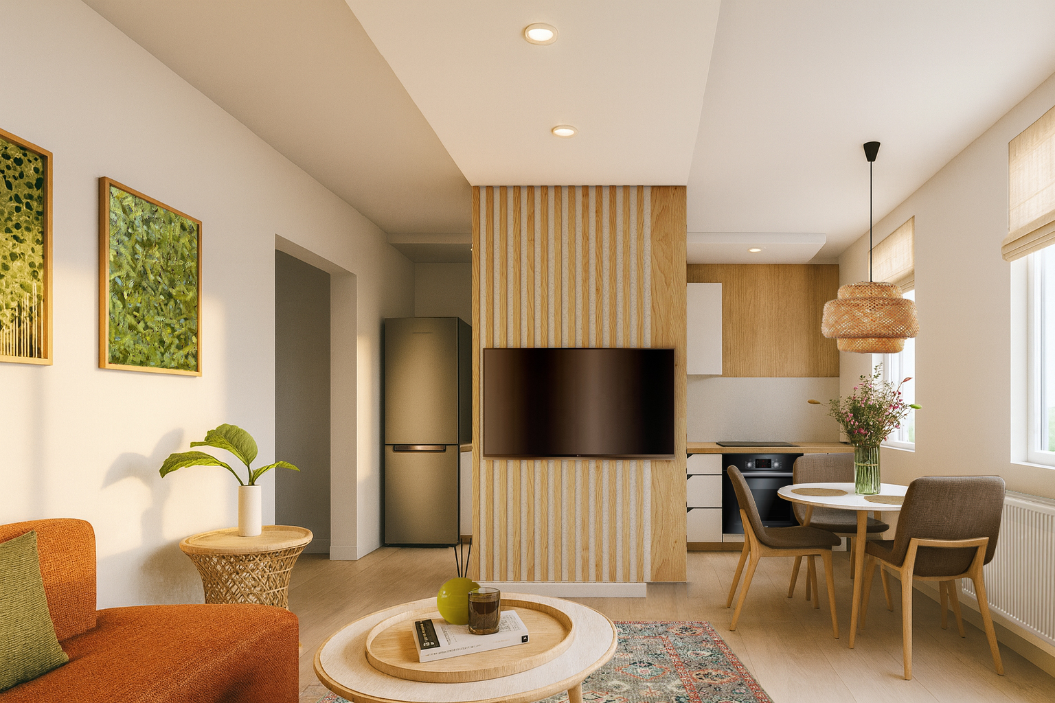The living area embraces warm hues of terracotta and beige, complemented by light wood textures and soft green accents. A built-in desk and reading nook make the space multifunctional, while minimalist wall art and sculptural lighting add a contemporary character. The kitchen and dining area continue the natural palette, using wood slats and woven textures to bring warmth and visual rhythm.