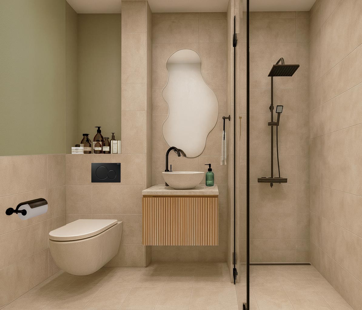 In the bedroom, soft textiles, organic patterns, and layered bedding in earthy greens and rust tones create a calm, inviting atmosphere. The bathroom design echoes the same philosophy—clean lines, natural tiles, and subtle contrast between beige and olive walls add a spa-like serenity.